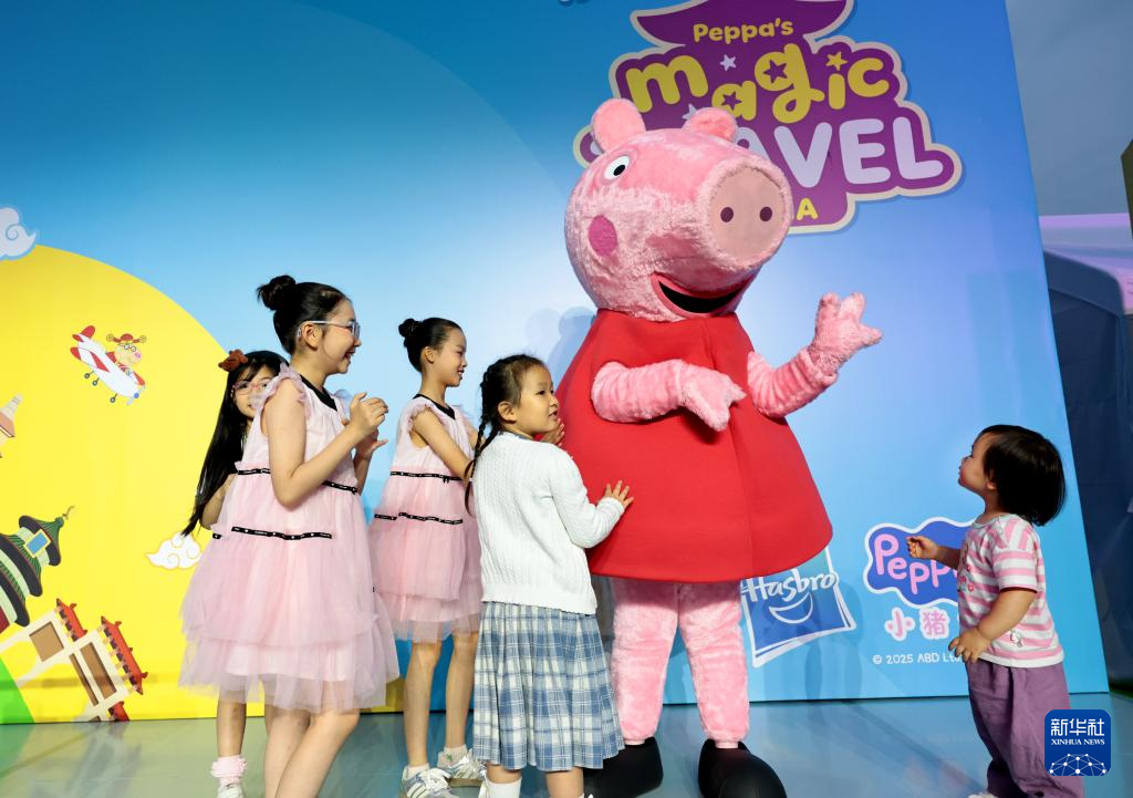 5月31日,工作人员装扮的佩奇玩偶与小朋友们互动。新华社记者 方喆 摄