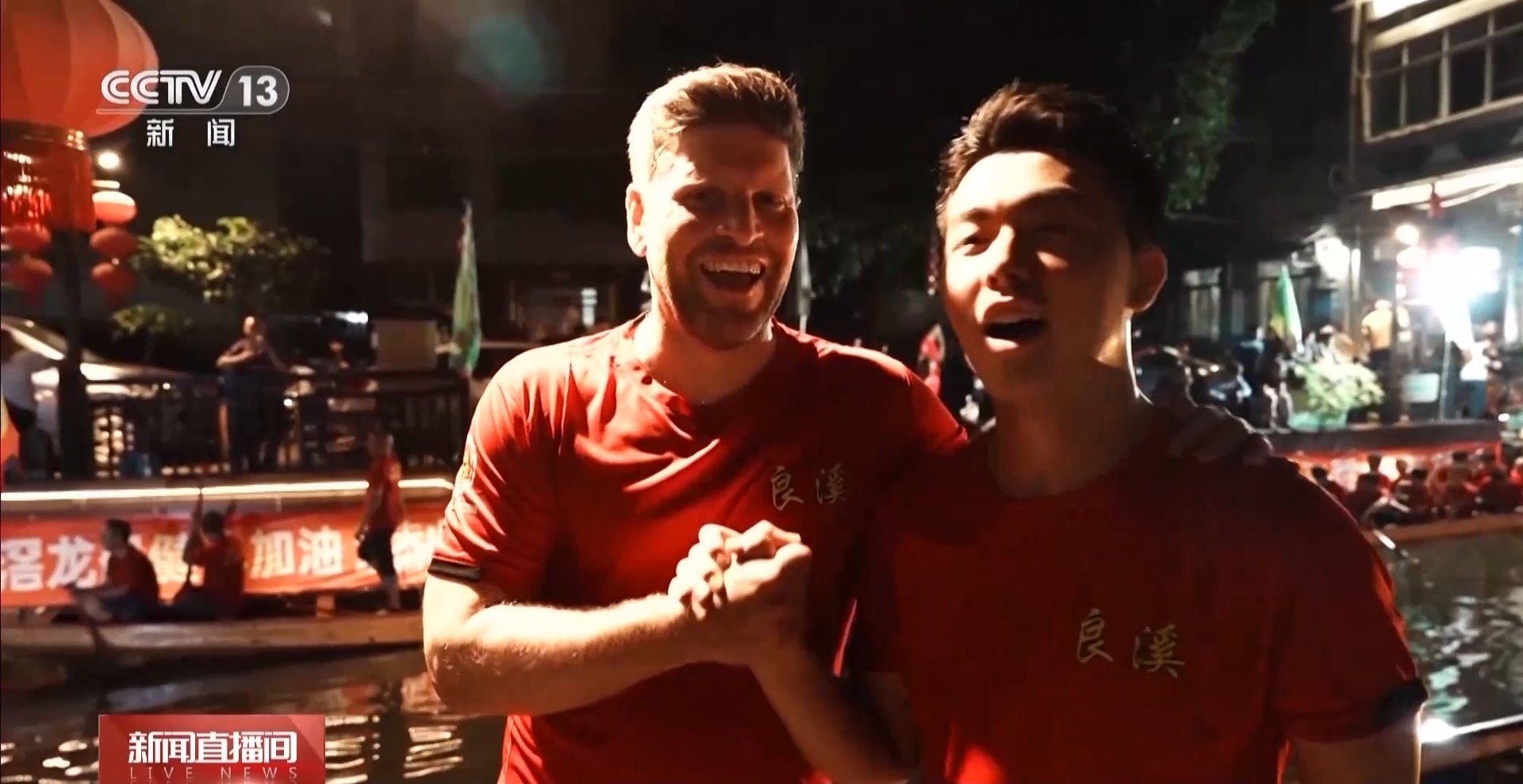 “一条龙船一条心”,这是本杰明对于龙舟精神最深刻的感悟。擅长英语的队友温永铖还带着他看游龙、洗龙船水、吃龙船饭。随着交流的不断深入,本杰明对于龙舟的喜爱,也逐渐从竞渡的激情,延伸到对于这项有着数百年历史的非遗项目的文化探寻。他感到龙舟比赛不仅是体育竞技,更代表着整个村子的同心协力。