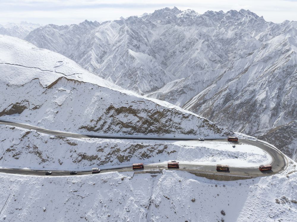 在新疆塔什库尔干塔吉克自治县,参加“盘龙古道”恢复通车仪式的车队在行进中(2025年3月22日摄)。新华社记者 徐宏岩 摄