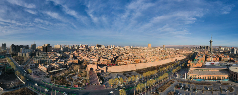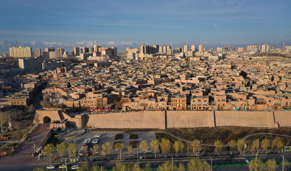 清晨,洒满阳光的喀什古城(2023年3月10日,无人机拍摄)。新华社记者 李响 摄