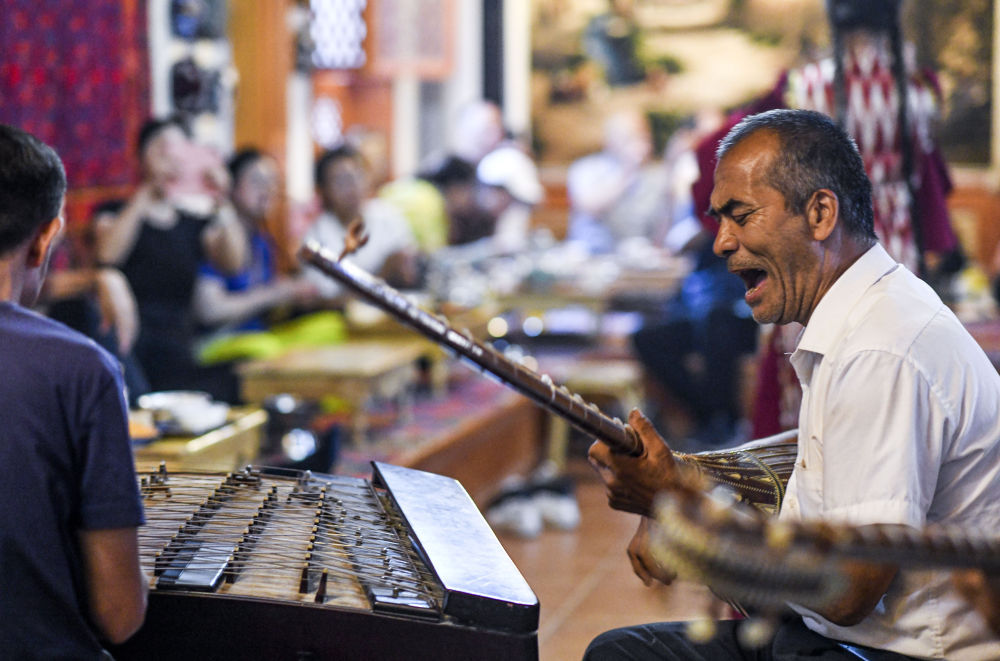乐手在新疆喀什古城百年老茶馆内弹唱(2023年9月15日摄)。新华社记者 王菲 摄