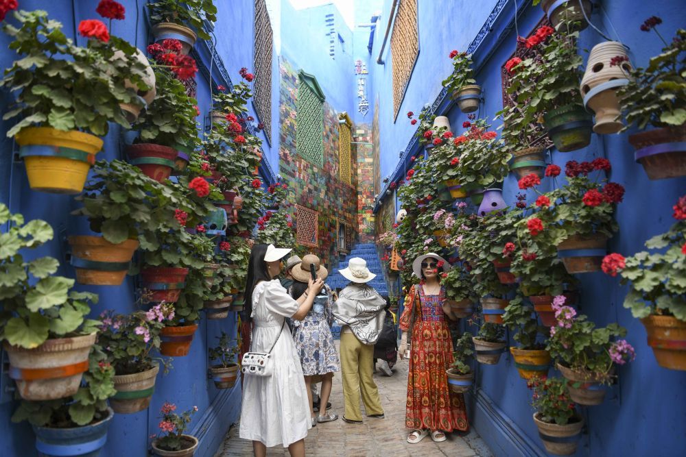 人们在新疆喀什古城景区彩虹巷内游玩拍照(2023年6月14日摄)。新华社记者 胡虎虎 摄