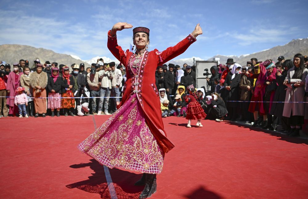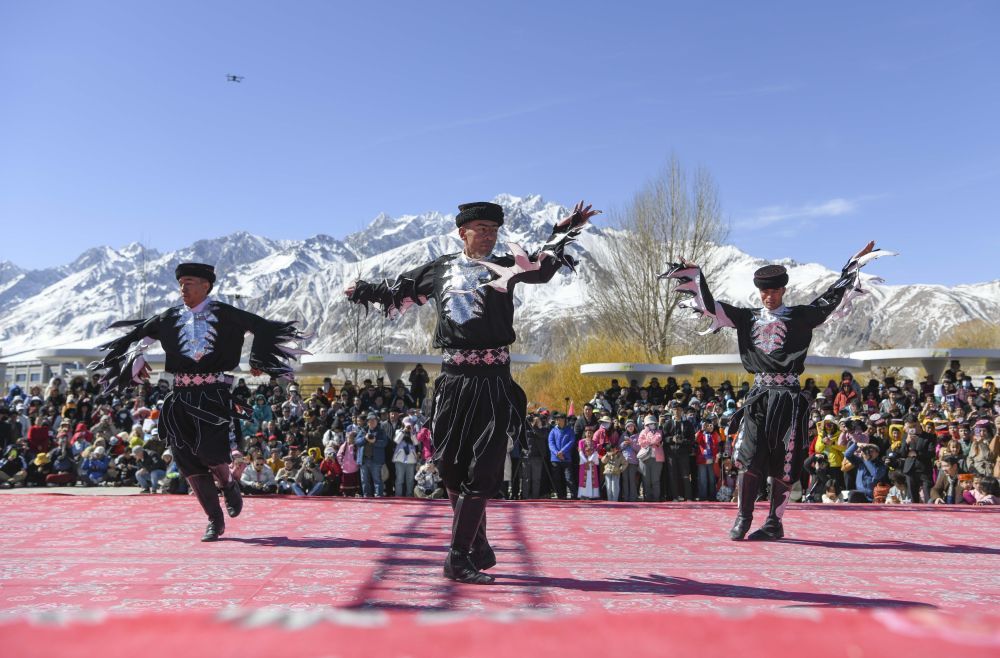 在新疆塔什库尔干塔吉克自治县提孜那甫乡赛马场,参与非遗展演的村民在跳舞(2025年3月23日摄)。新华社记者 胡虎虎 摄