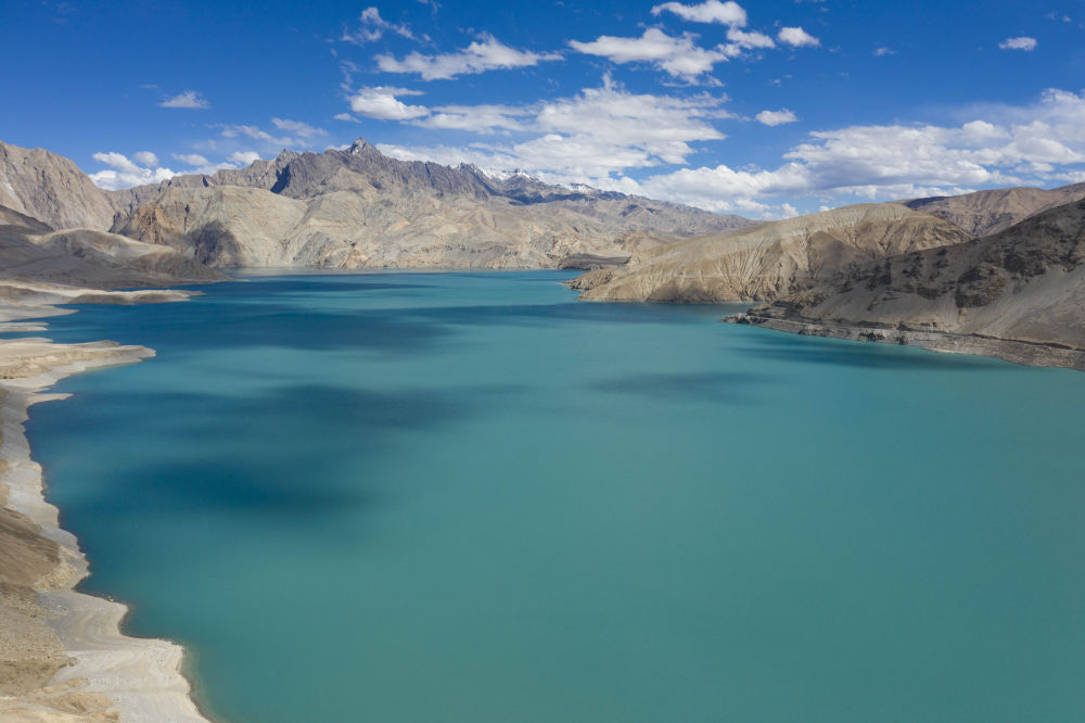 位于新疆塔什库尔干塔吉克自治县的“班迪尔蓝湖”一角(2023年8月28日摄,无人机照片)。新华社记者 胡虎虎 摄