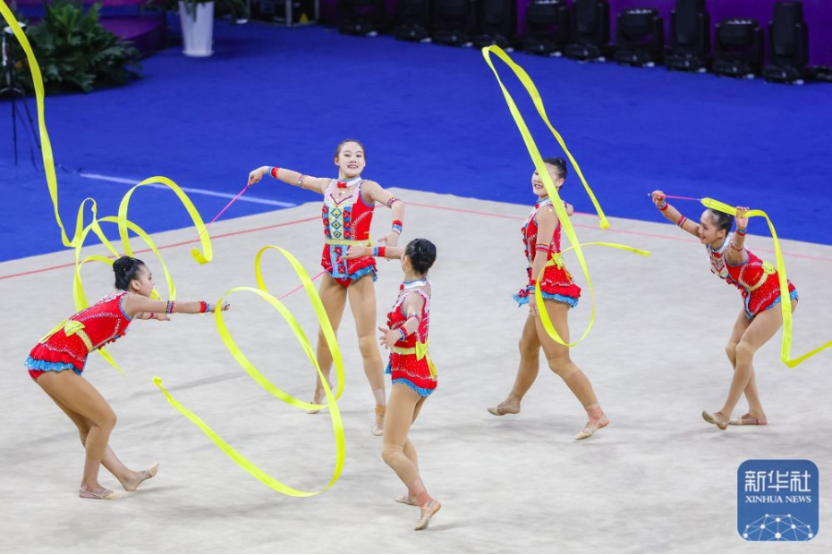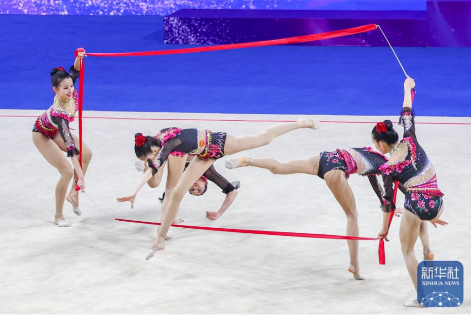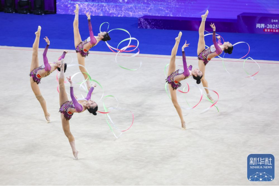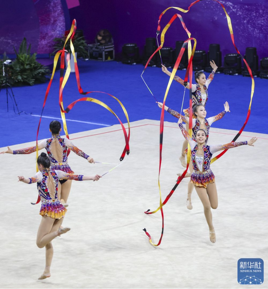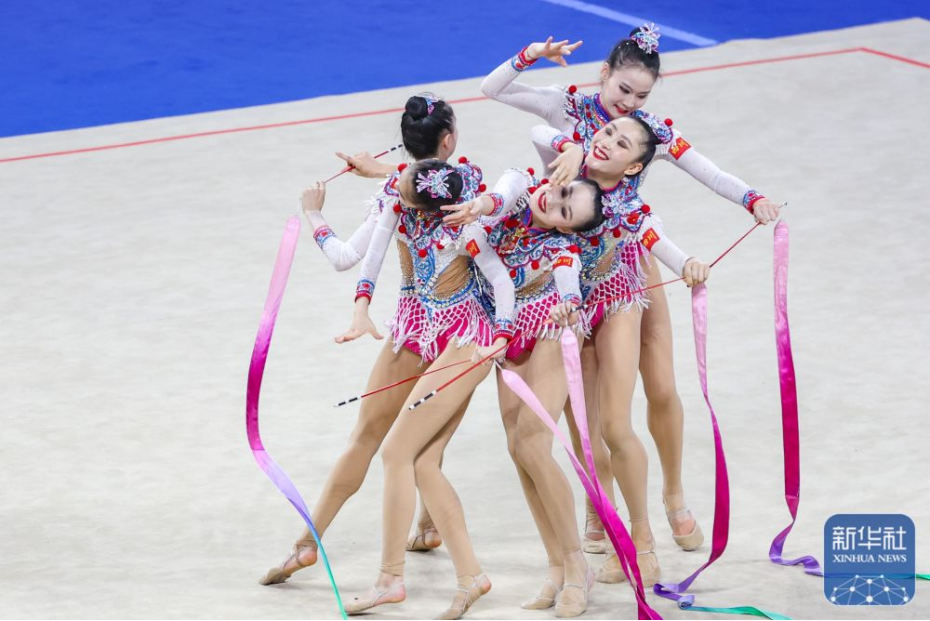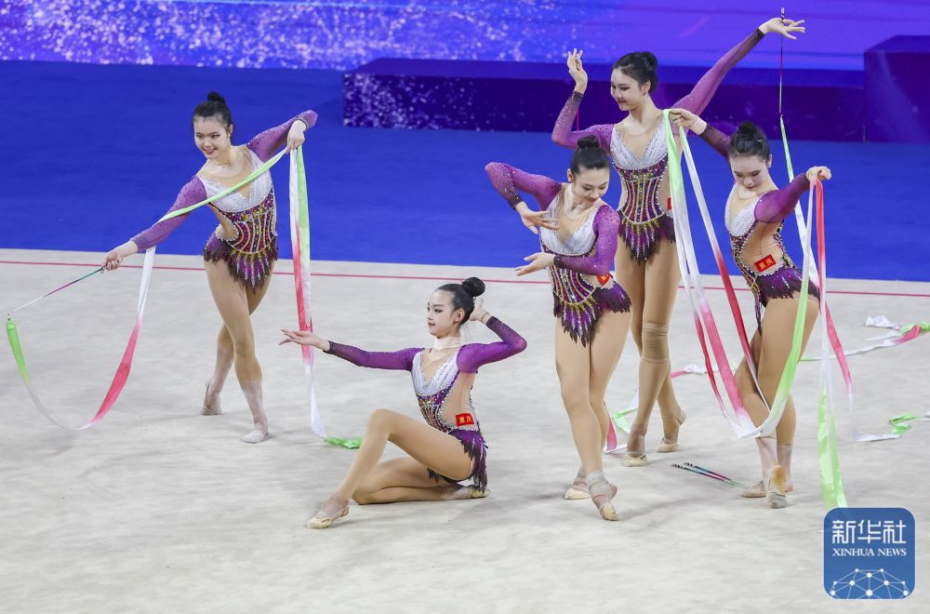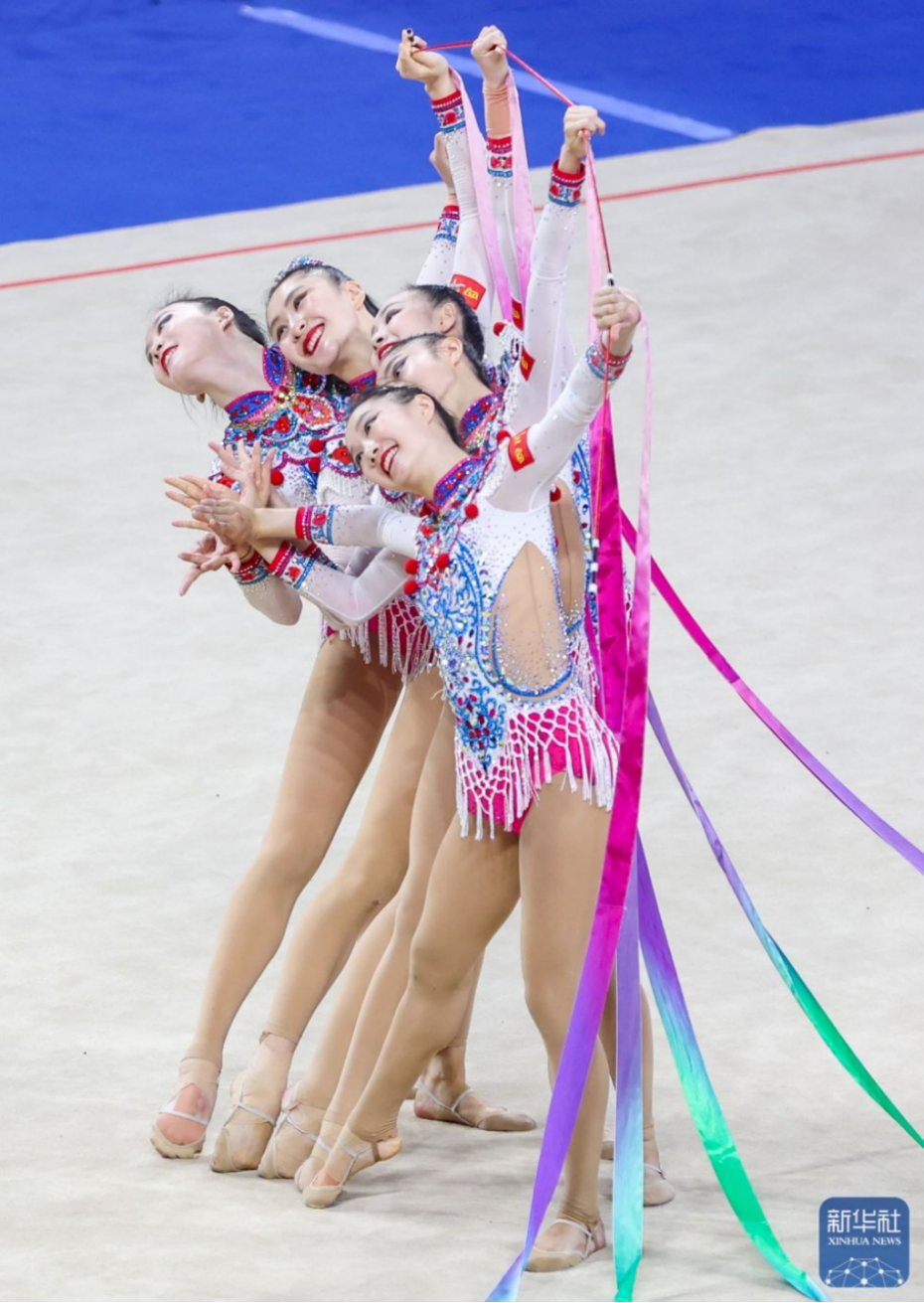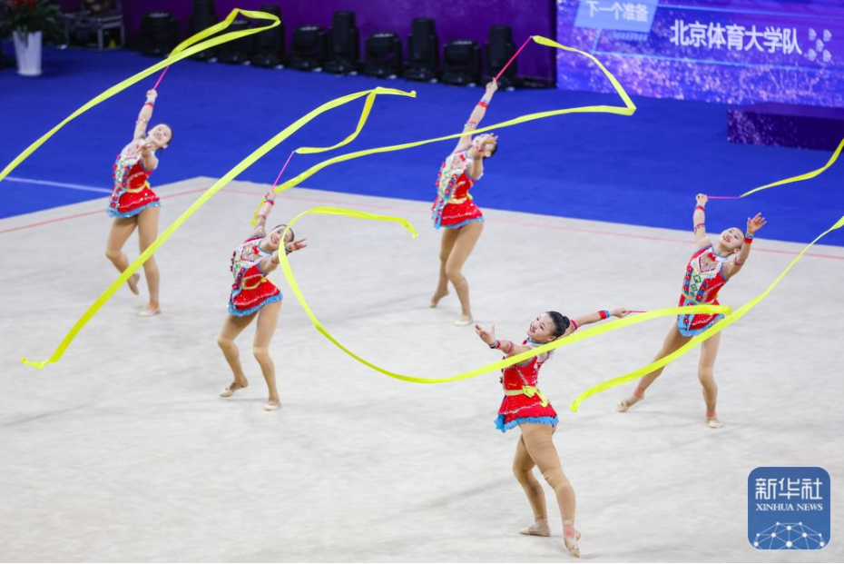 北京体育大学队在成年集体5带资格赛中。新华社记者 陈诚 摄