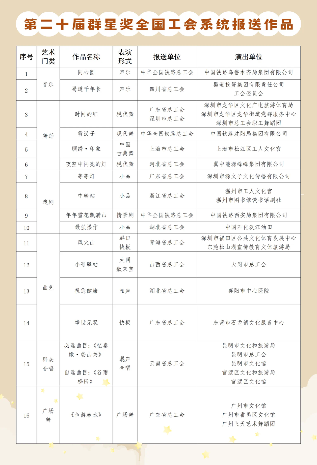 日前,按照文化和旅游部《关于开展第二十届群星奖评奖工作的通知》要求,全国总工会宣传教育部(以下简称全总宣教部)在工会系统认真组织开展了第二十届群星奖作品的报送工作,经征集、专家评审、送审、公示等环节,共向文旅部报送六个门类、16部职工文艺作品(名单附后)。