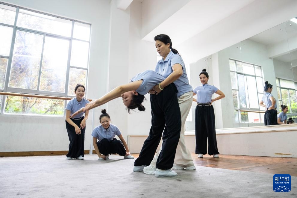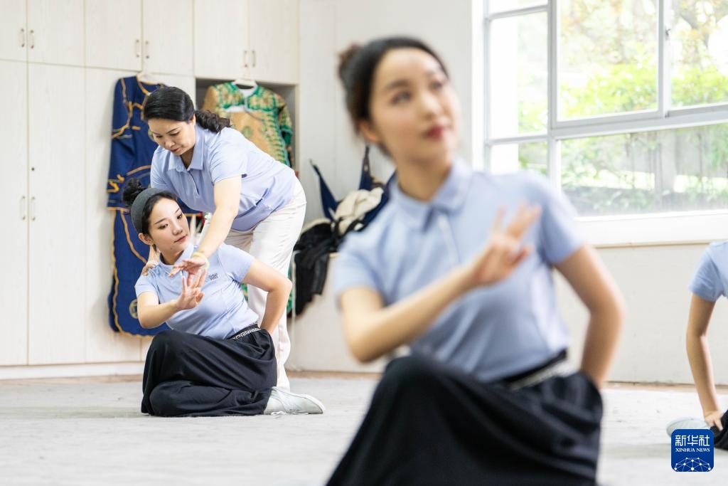 6月4日,在湖南省昆剧团练功房,资深演员王荔梅(前右)在帮助青年演员练习基本功。新华社记者 陈思汗 摄