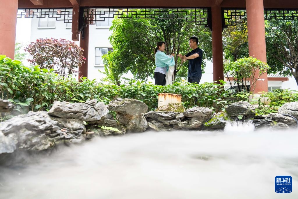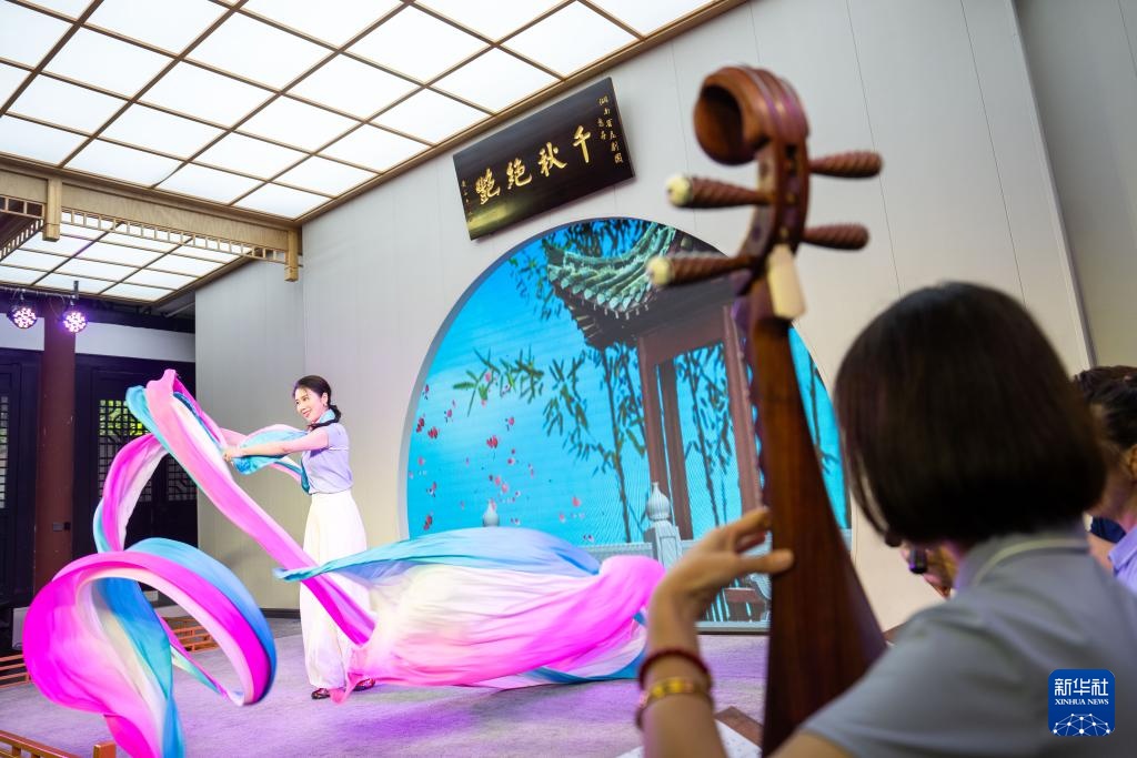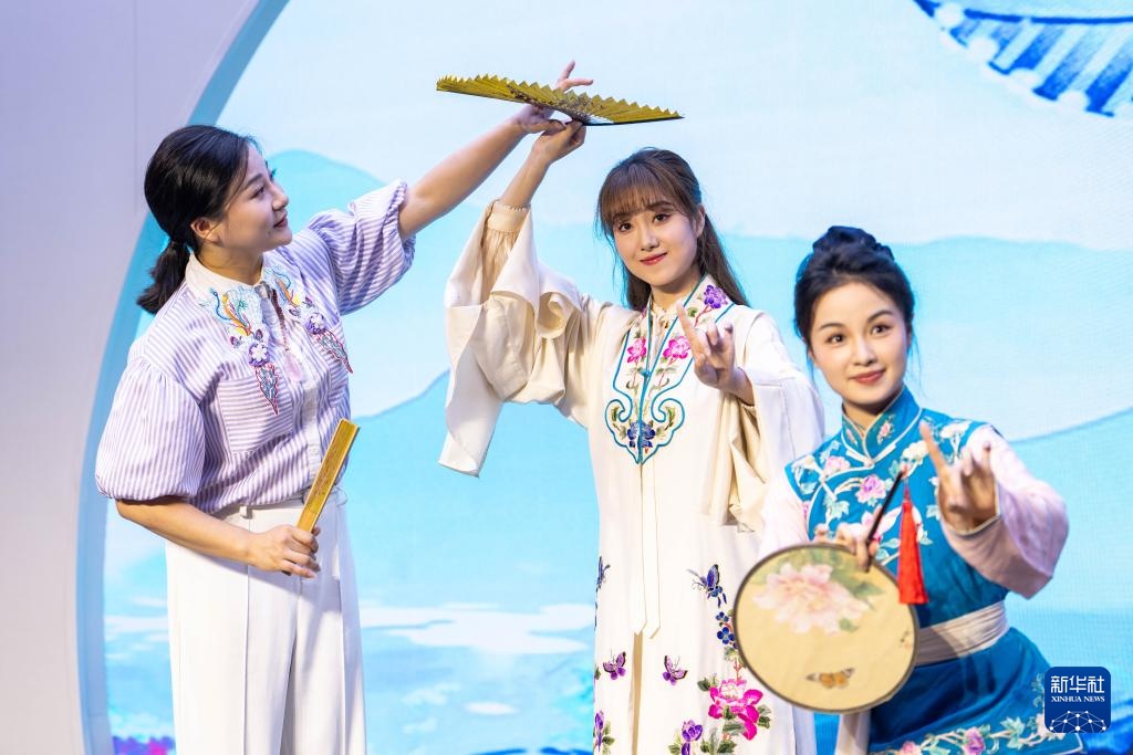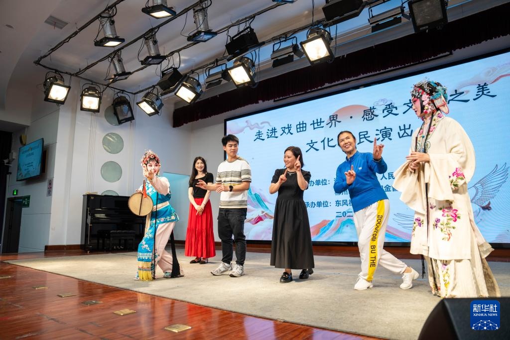 6月4日,在郴州市北湖区人民路街道万花冲社区,湖南省昆剧团青年演员(左一、右一)在带领观众体验昆曲。新华社记者 陈思汗 摄
