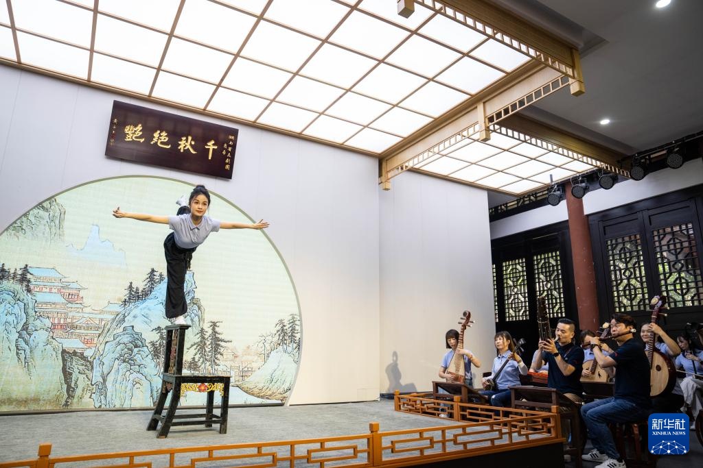 6月4日,在湖南省昆剧团小剧场,青年演员许颖在练习“椅子功”。新华社记者 陈思汗 摄