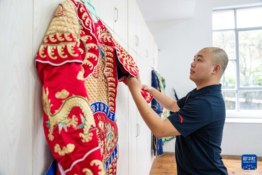 6月4日,在湖南省昆剧团练功房,青年演员蔡俊凯在整理戏服。新华社记者 陈思汗 摄