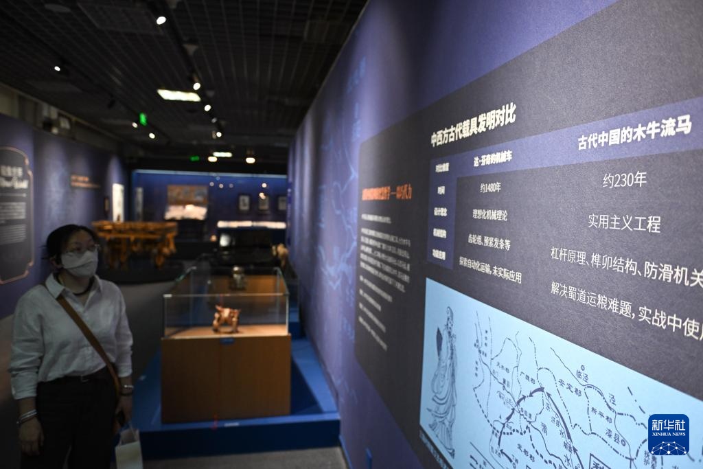6月5日,参观者在观看展览中一处讲解中西方古代载具发明的展板。新华社记者 陈钟昊 摄