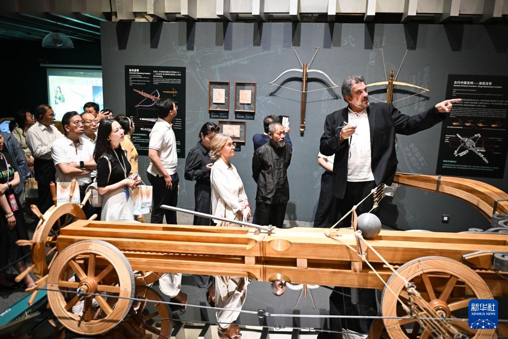 6月5日,意大利达·芬奇学院创办人、院长马里奥·塔代伊(右一)在为观众介绍展品。新华社记者 陈钟昊 摄