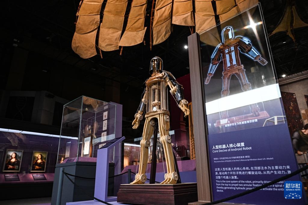 这是6月5日在展览上拍摄的根据达·芬奇手稿重建的人型机器人模型。新华社记者 陈钟昊 摄
