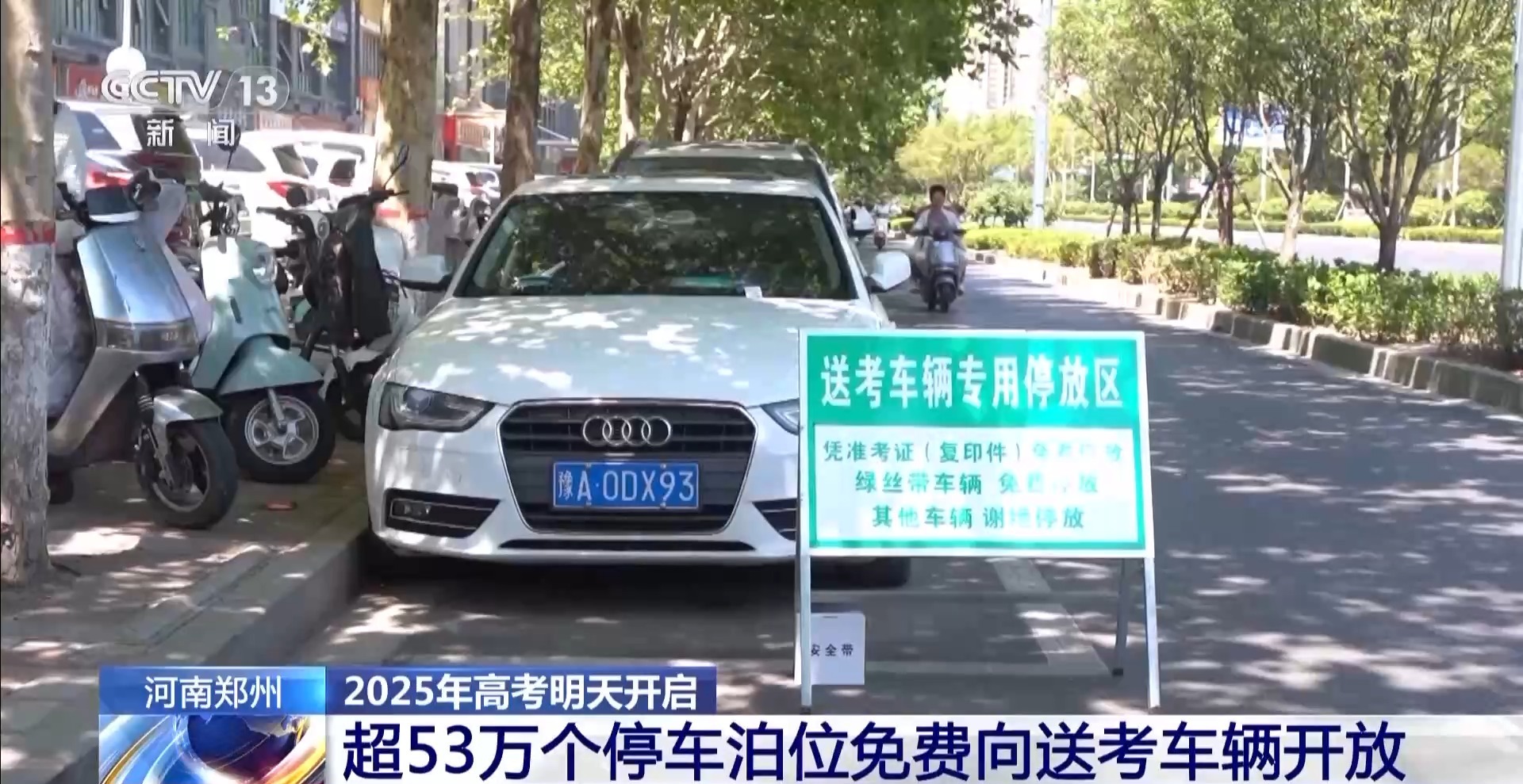 在河南郑州,公交、城管等部门通过开展噪声管控、开放免费停车泊位。在郑州市一个考点附近,周边的道路停车泊位上,已经设置了“送考车辆专用停放区”的引导牌。旁边一个经营性停车场,考试期间也向送考车辆免费开放。据了解,今年高考期间,郑州城管部门共设置各类高考停车泊位超53万个。