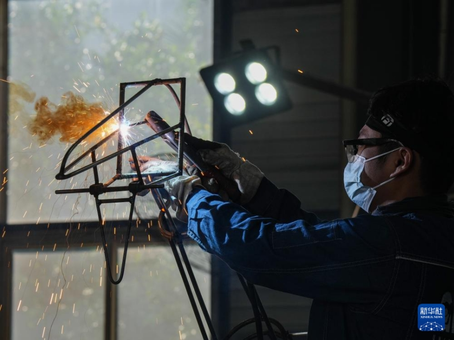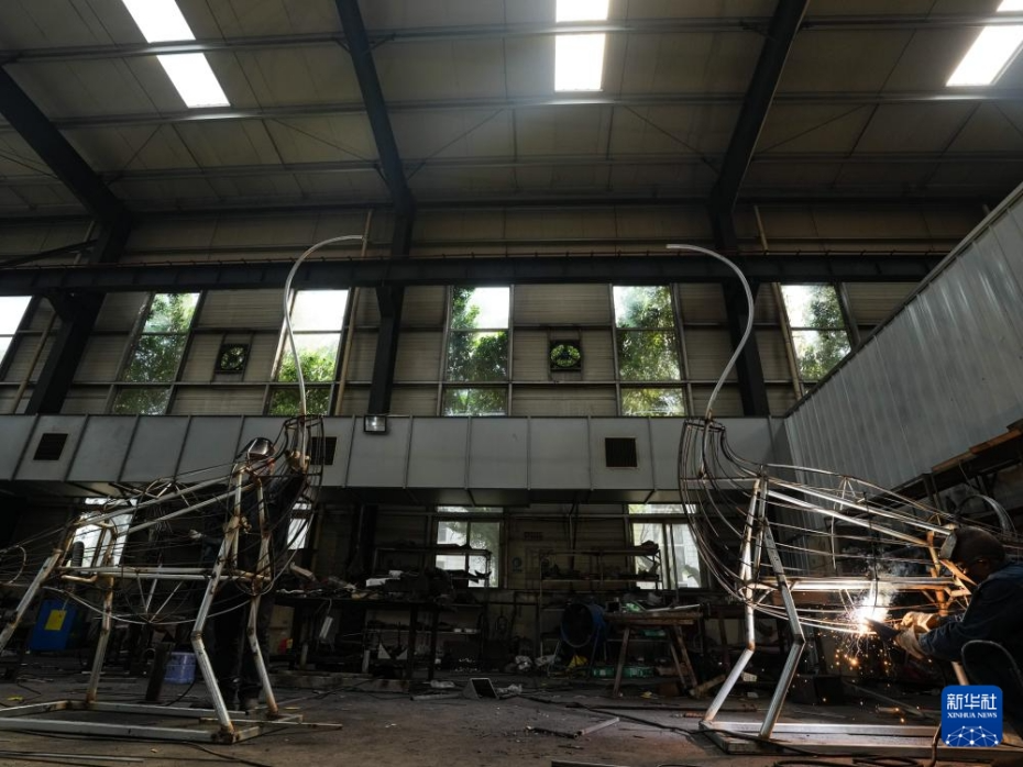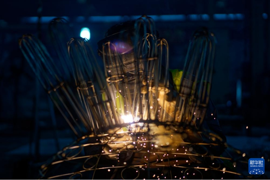 2025年6月4日,工作人员在四川省自贡市灯彩集团厂房内为彩灯焊接骨架。新华社记者 张笑宇 摄