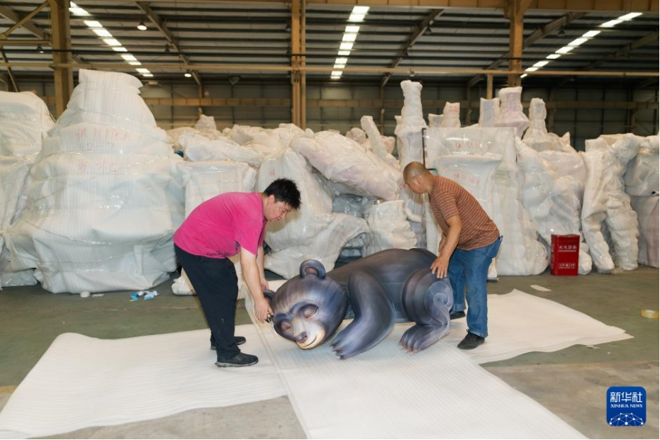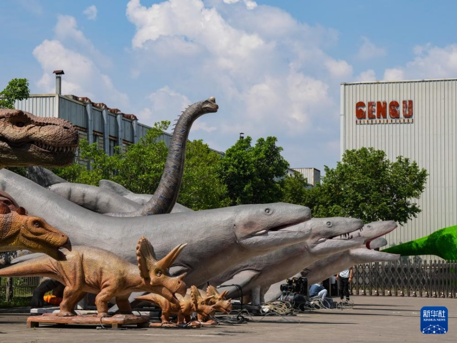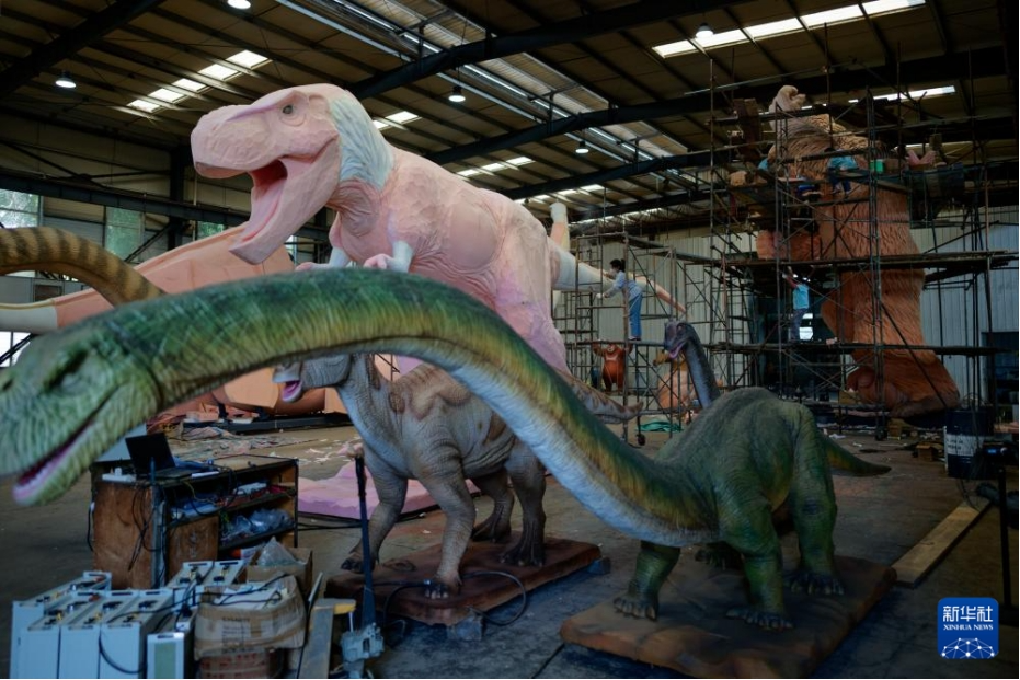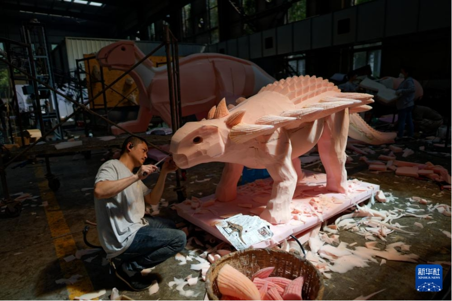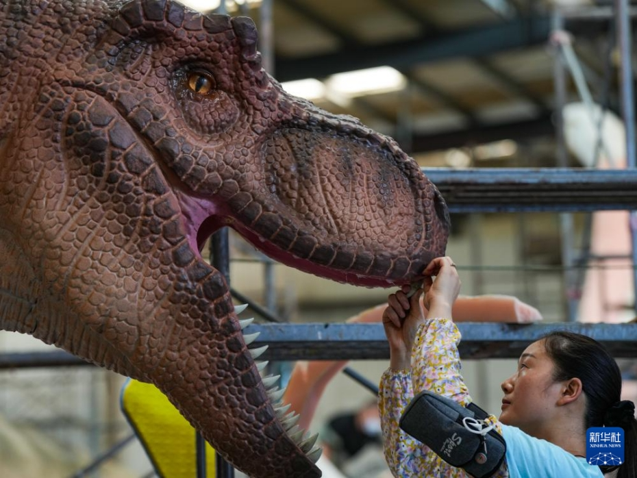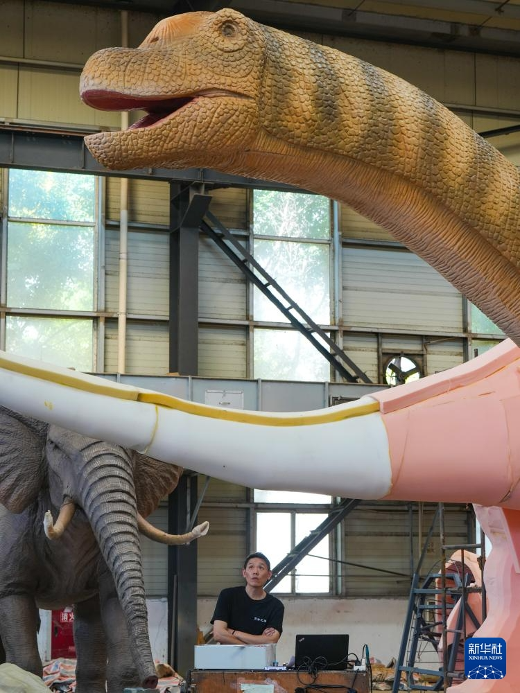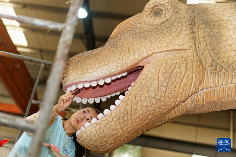 2025年6月4日,工作人员在四川省自贡市自贡亘古龙腾科技有限公司的厂房内为仿真恐龙进行精细造型工作。新华社记者 张笑宇 摄