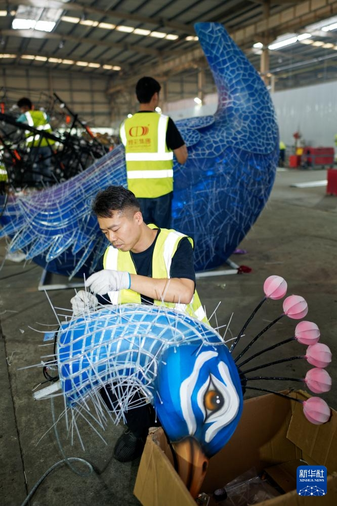 2025年6月4日,工作人员在四川省自贡市灯彩集团厂房内为孔雀彩灯捆绑灯条。新华社记者 张笑宇 摄