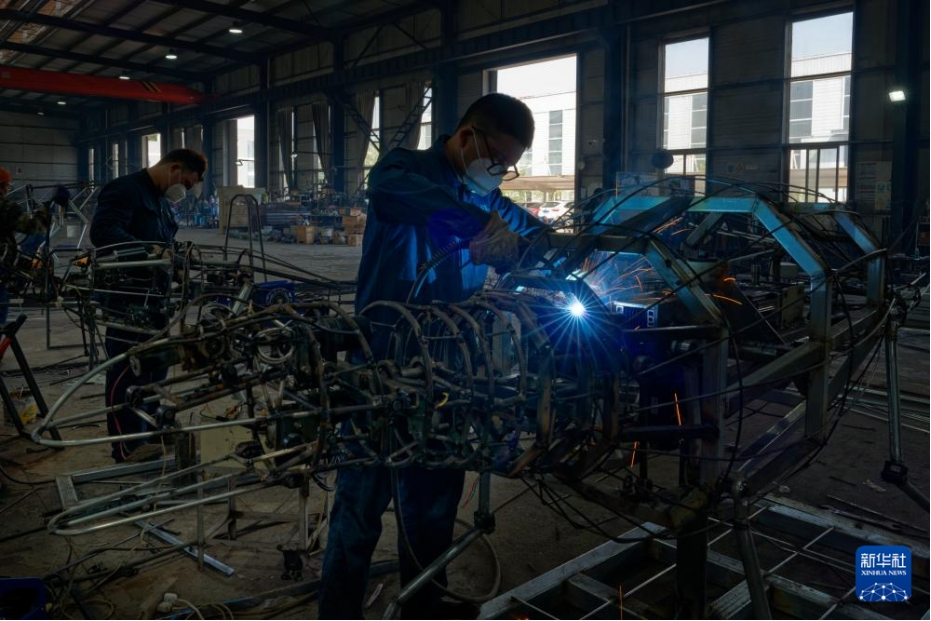 2025年6月4日,工作人员在四川省自贡市自贡亘古龙腾科技有限公司的厂房内焊接仿真恐龙的骨架和电机。新华社记者 张笑宇 摄