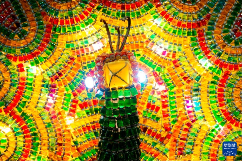 这是2025年6月5日在四川省自贡市中国彩灯博物馆拍摄的用玻璃药瓶制作的彩灯“孔雀开屏”。新华社记者 张笑宇 摄