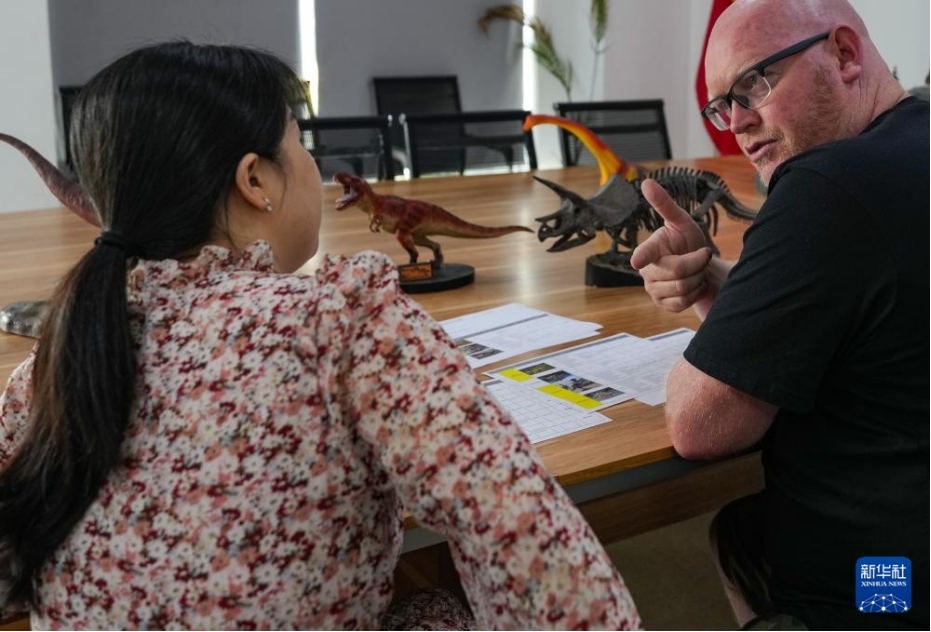 2025年6月4日,在四川省自贡市自贡亘古龙腾科技有限公司,来自澳大利亚的客户(右)在洽谈仿真恐龙贸易业务。新华社记者 王曦 摄