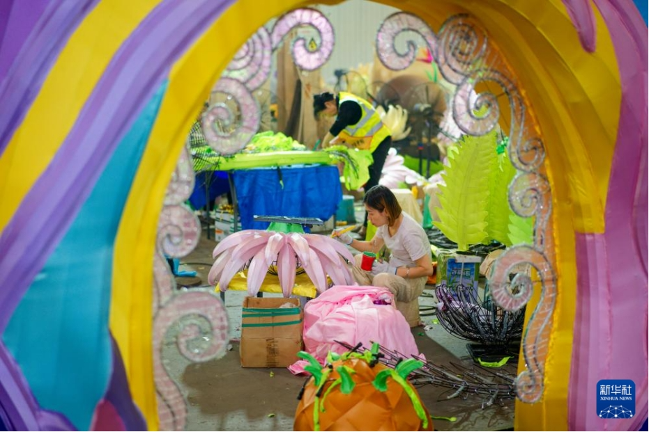 2025年6月4日,工人在四川省自贡市灯彩集团厂房内为彩灯喷绘上色。新华社记者 王曦 摄