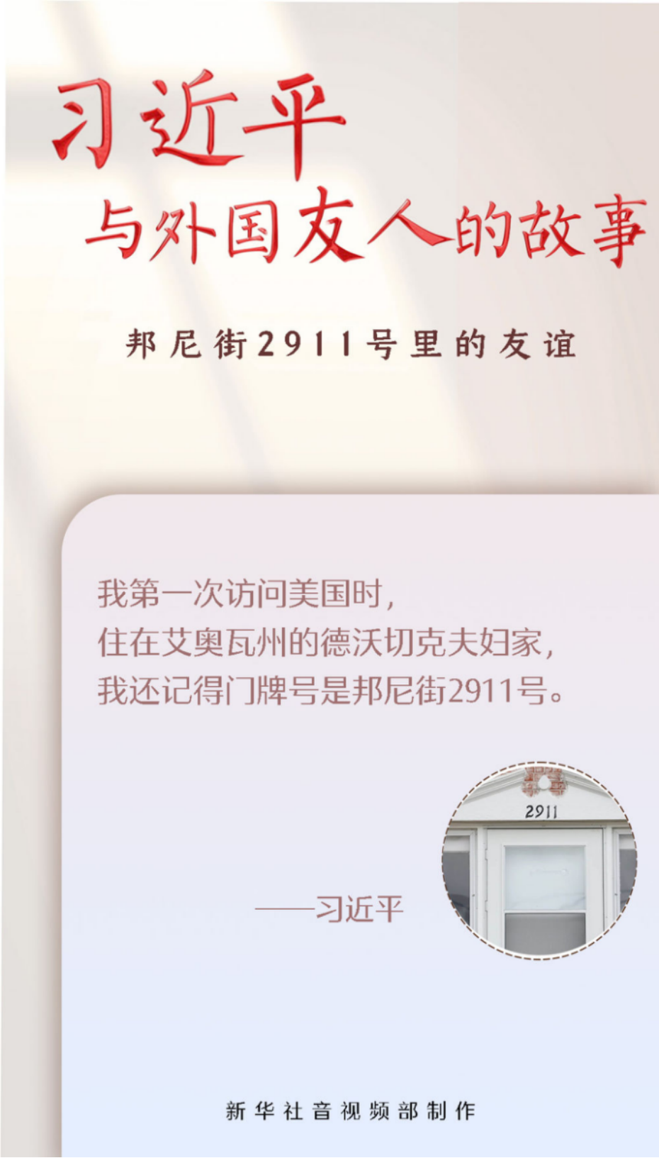 1985年,时任河北省正定县委书记的习近平率团访问艾奥瓦州,住在马斯卡廷邦尼街2911号的德沃切克夫妇家中。那是习近平同美国民众首次面对面接触,访问期间,他同当地人民结下了深厚友谊。