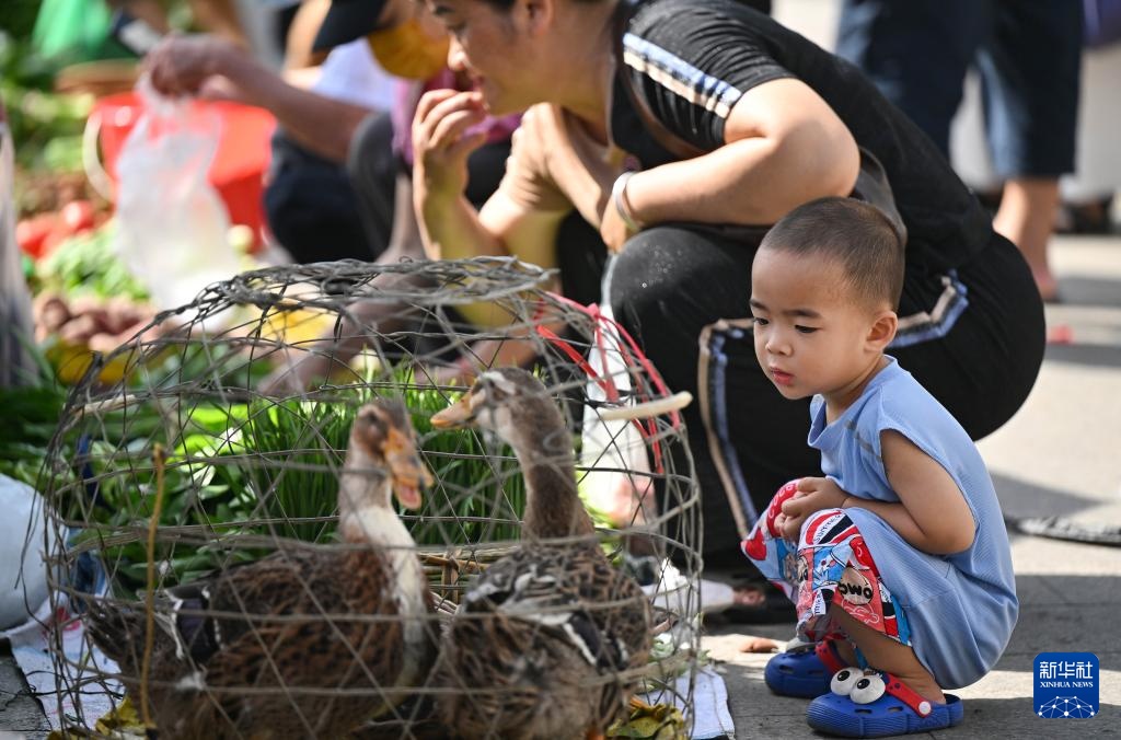 6月7日,小朋友在打量集市上售卖的鸭子。新华社记者 郭程 摄