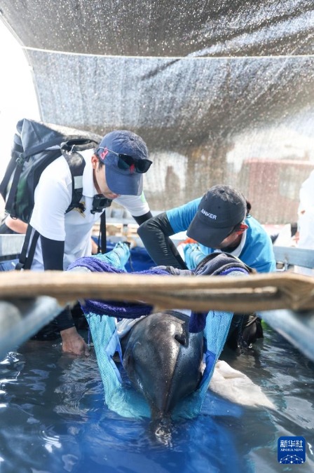6月8日,救助人员在船上看护糙齿海豚“阳阳”。新华社记者 张丽芸 摄
