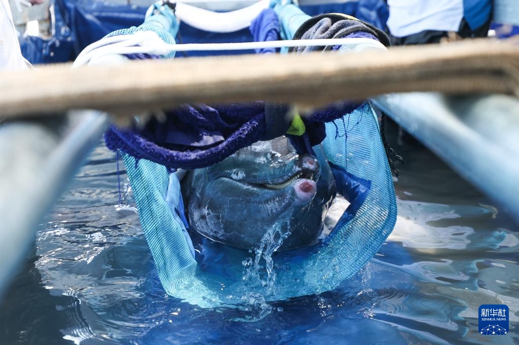 6月8日,救助人员将糙齿海豚“阳阳”转运到船上。新华社记者 张丽芸 摄