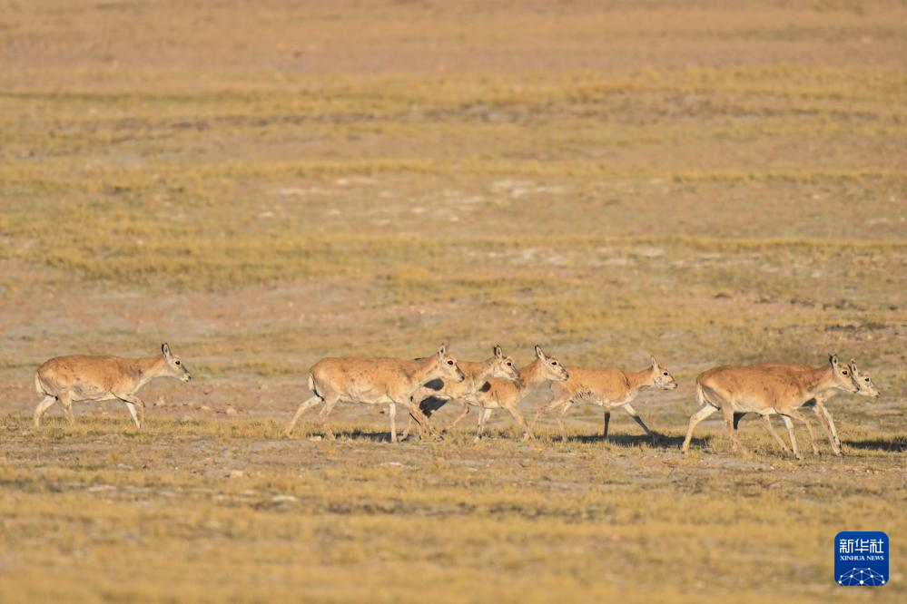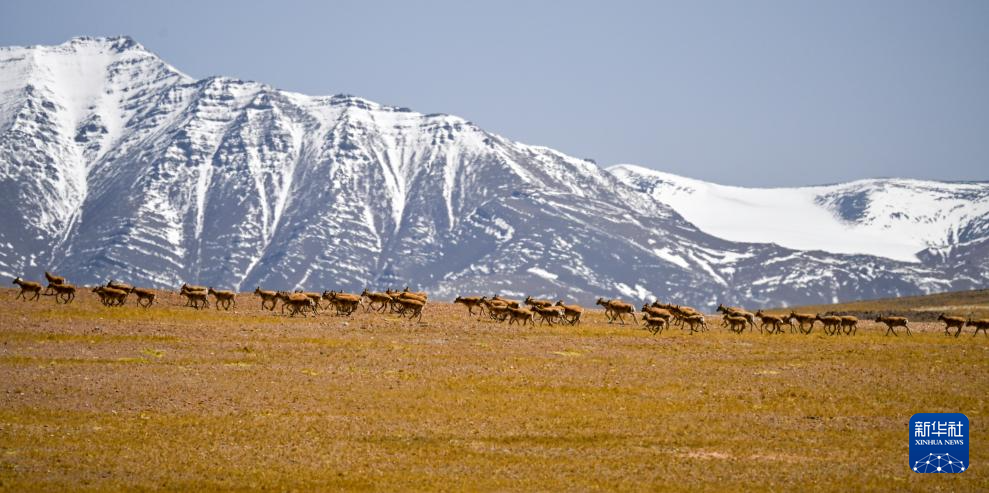 一群雌性藏羚羊在羌塘国家级自然保护区核心区内繁殖迁徙(6月8日摄)。新华社记者 刘金海 摄
