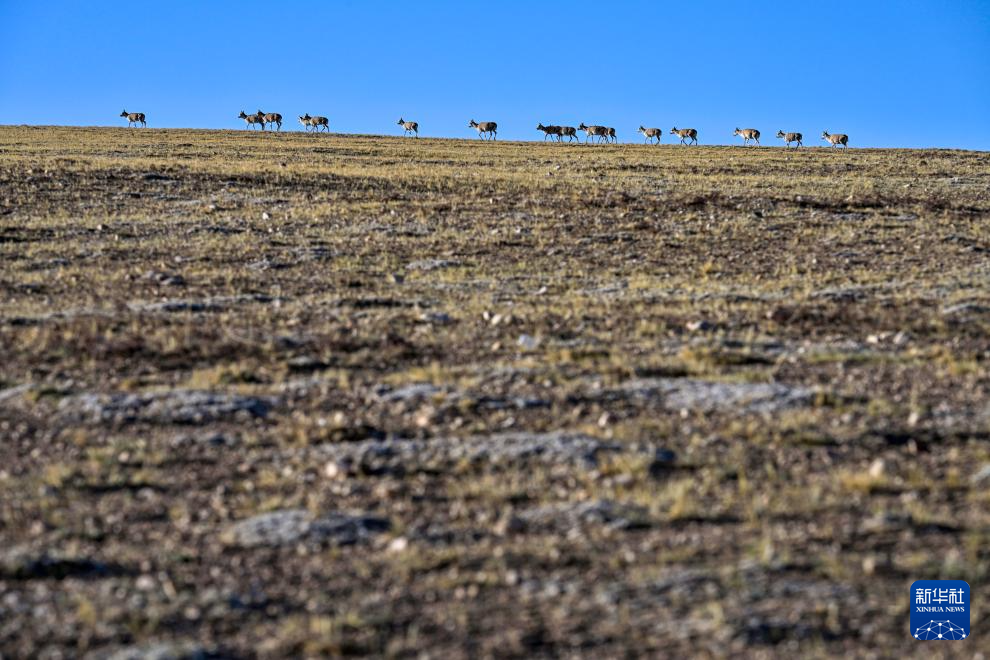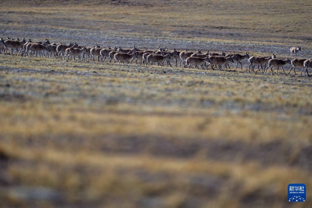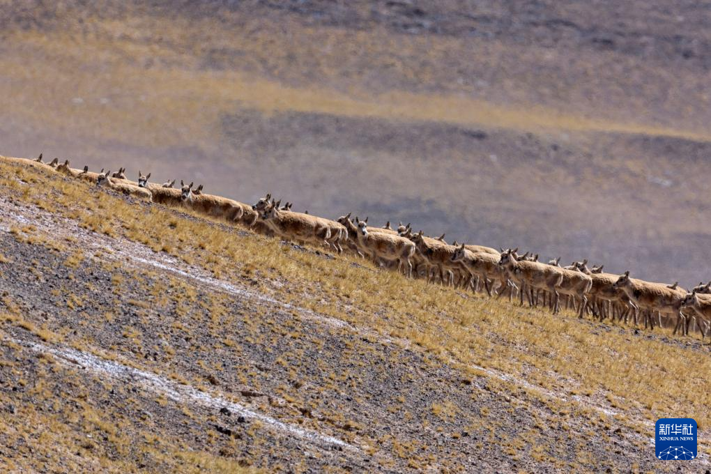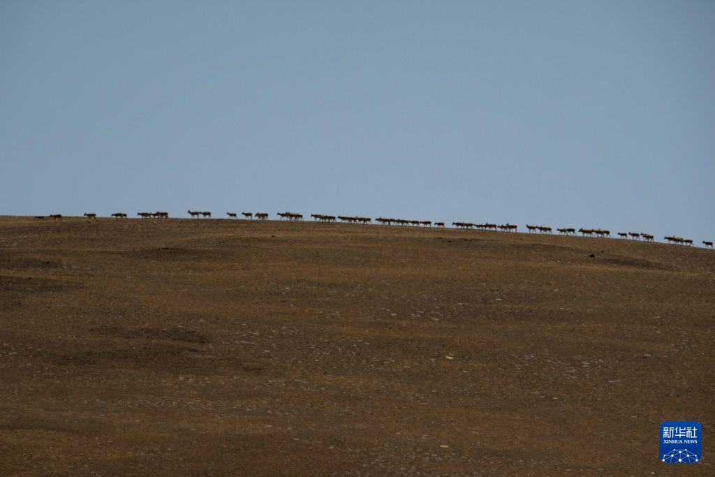在羌塘国家级自然保护区核心区拍摄的迁徙中的雌性藏羚羊群(6月8日摄)。新华社记者 旦增尼玛曲珠 摄