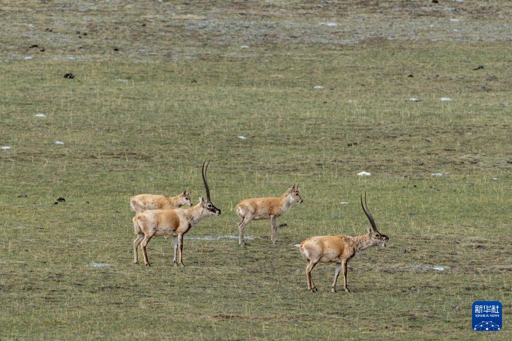 在羌塘国家级自然保护区核心区拍摄到的雄性和亚成体雌性藏羚羊(6月9日摄)。新华社记者 旦增尼玛曲珠 摄
