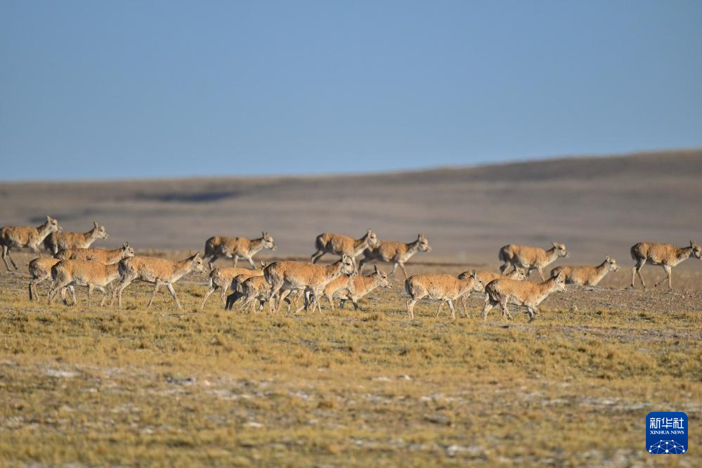 一群雌性藏羚羊在羌塘国家级自然保护区核心区内进行繁殖迁徙(6月10日摄)。新华社记者 刘金海 摄