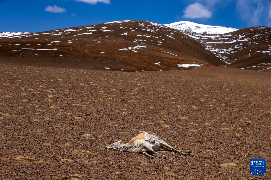 一头雌性藏羚羊在羌塘国家级自然保护区核心区繁殖迁徙的路上死于狼口(6月8日摄)。新华社记者 姜帆 摄