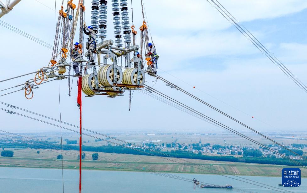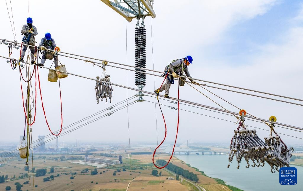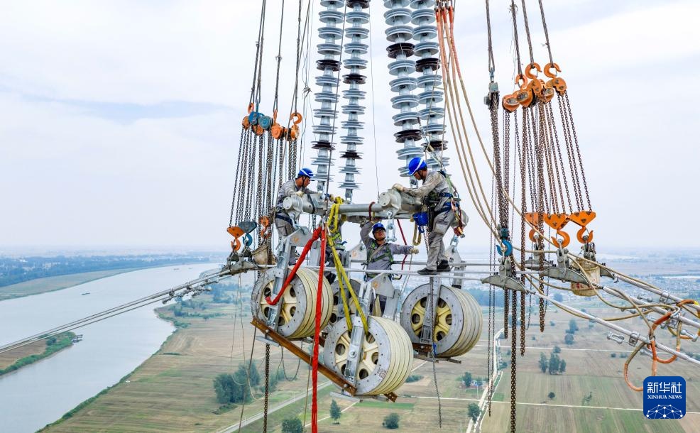 6月11日,在安徽省滁州市凤阳县淮河边,安徽送变电工程有限公司施工人员在百米高空进行淮河大跨越作业(无人机照片)。新华社记者 刘军喜 摄