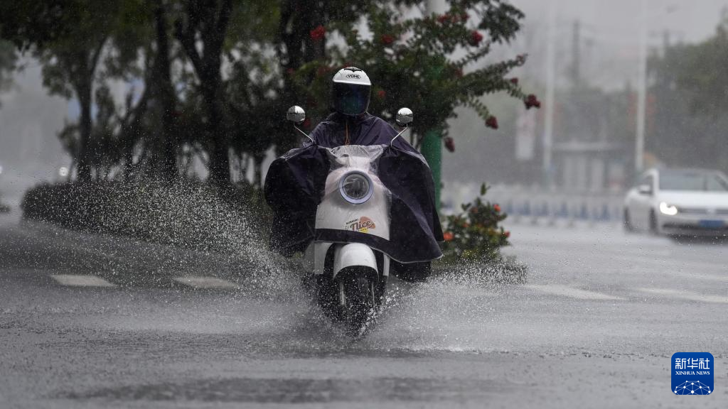 6月14日,市民冒雨在广西北海市骑行。新华社记者 张爱林 摄