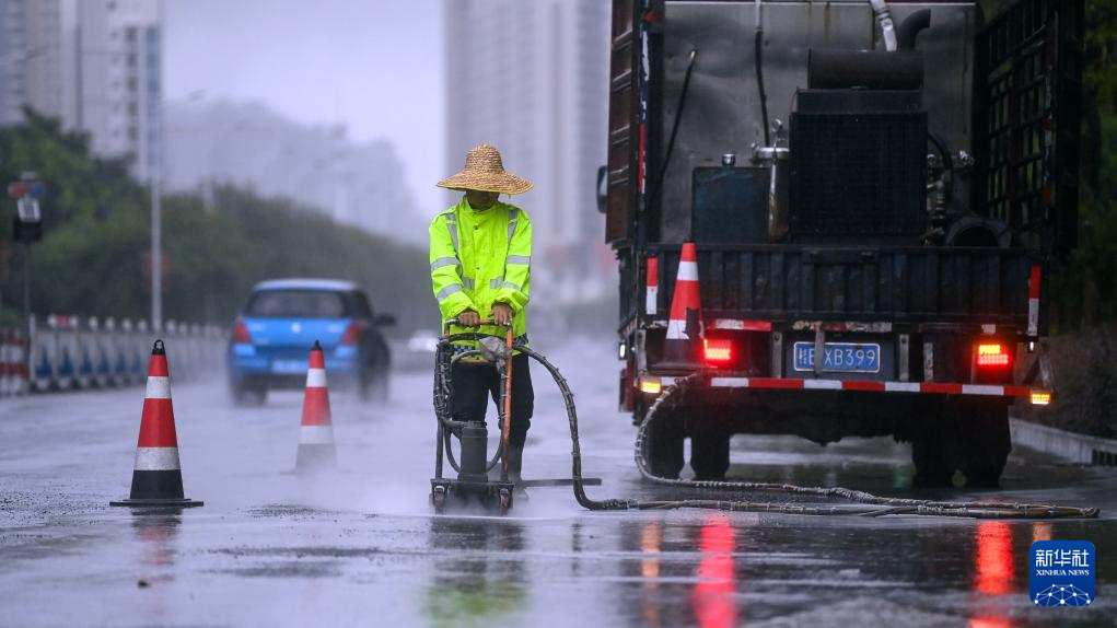 6月14日,在广西北海市,一名工人在冒雨抢修受损路面。新华社记者 张爱林 摄