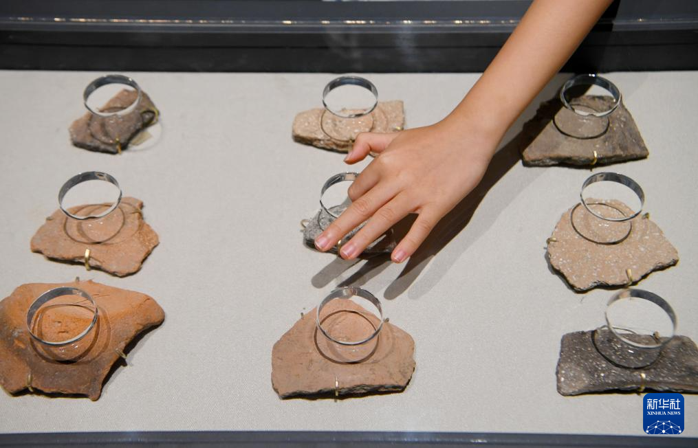 6月14日,参观者在大河村遗址博物馆新馆触摸陶片。新华社记者 郝源 摄