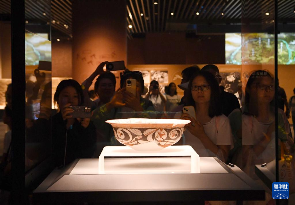 6月14日,参观者在大河村遗址博物馆新馆观看展品白衣彩陶盆。新华社记者 郝源 摄