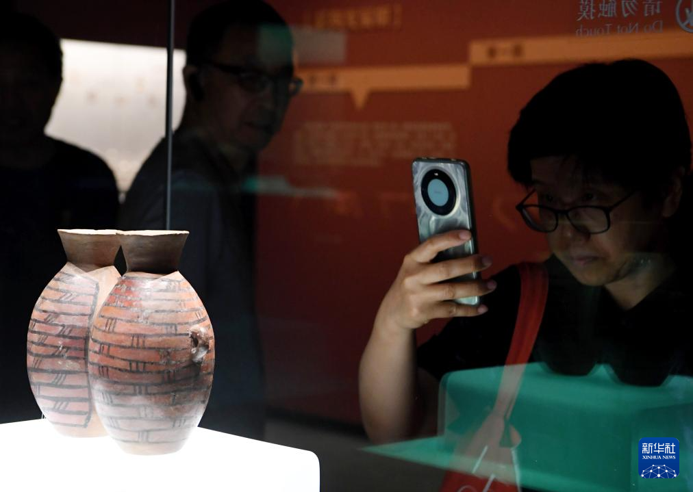 6月14日,参观者在大河村遗址博物馆新馆内拍摄展品彩陶双连壶。新华社记者 郝源 摄