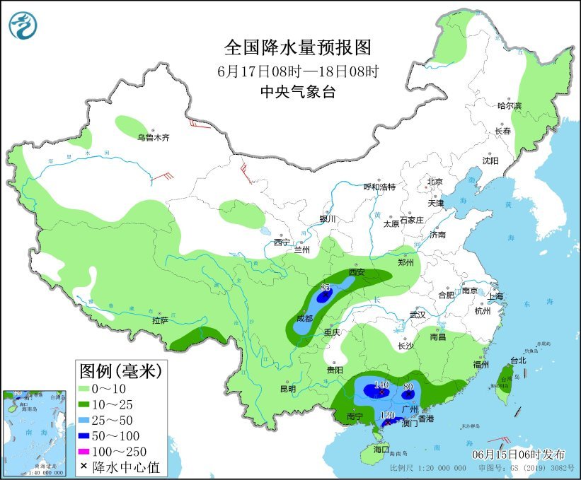 6月17日08时至18日08时,西北地区东南部、西南地区东北部、华南大部、台湾岛等地部分地区有中到大雨,其中,四川盆地北部、广西东北部、广东中西部和西南部沿海等地部分地区有暴雨或大暴雨(100~140毫米)。内蒙古西北部、新疆南疆盆地和东部等地部分地区有4~6级风。