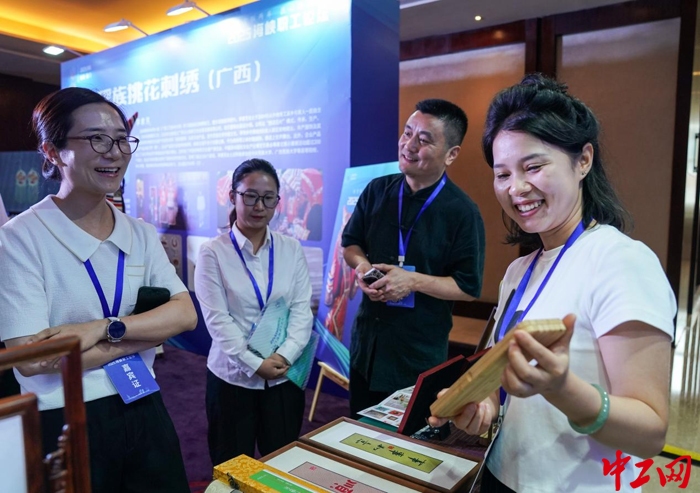 图为2025海峡职工论坛传统工艺非遗产品展示区的青神竹编展位。全国劳动模范陈岚(右二)与参会人员交流。中工网记者 王鑫 摄