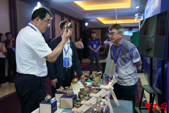 图为2025海峡职工论坛传统工艺非遗产品展示区的柴烧窑(台湾)展位,参会人员与柴烧陶艺传承人吴重毅老师(右一)交流。中工网记者 王鑫 摄