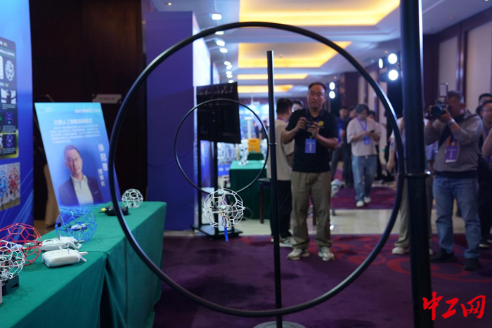 图为2025海峡职工论坛智能高科技产品展示区的无人机空中足球展位,工作人员演示足球在空中穿越球门。中工网记者 王鑫 摄