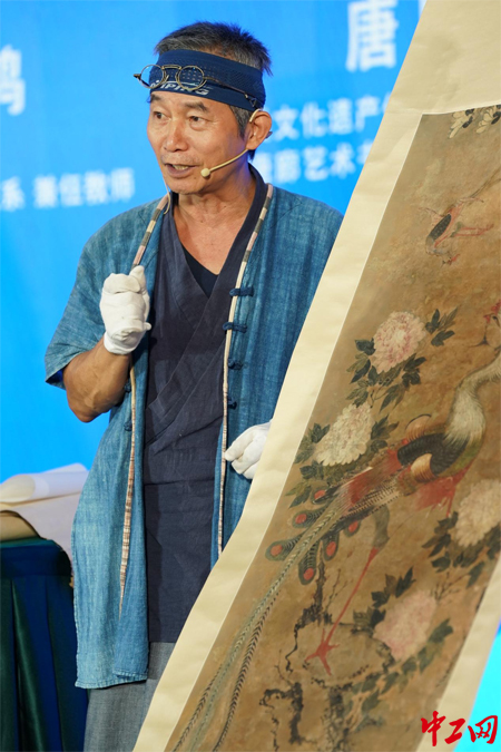 2025年度子活动成果展示环节中,来自台湾的非物质文化遗产传承人、文物修复师、鉴定师、台湾唐廊艺术书画院院长唐思瑛向参会人员展示宋代宫廷画《凤求凰》。中工网记者 王鑫 摄