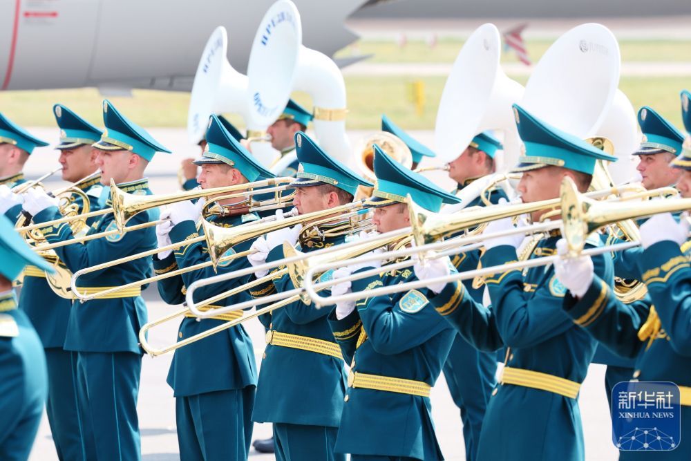 身着盛装的哈萨克斯坦女青年向习近平献花。礼兵分列蓝地毯两侧致敬,哈萨克斯坦少年儿童手持中哈两国国旗热烈欢迎习近平到访。