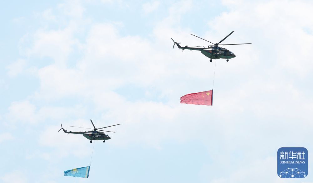 直升机悬挂中哈国旗从机场上空飞过。