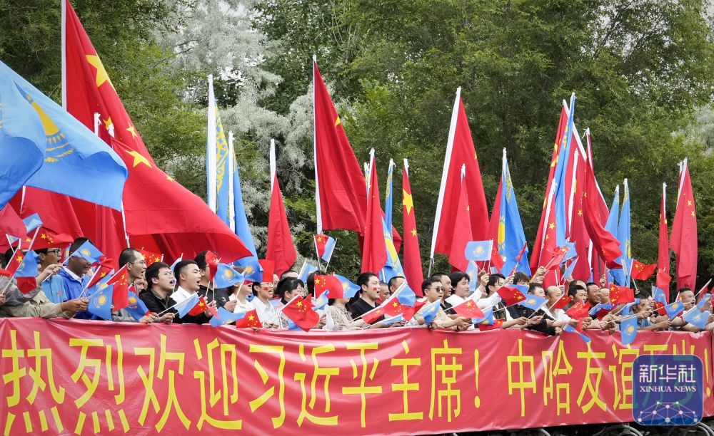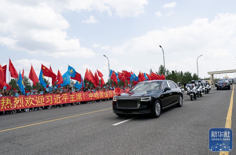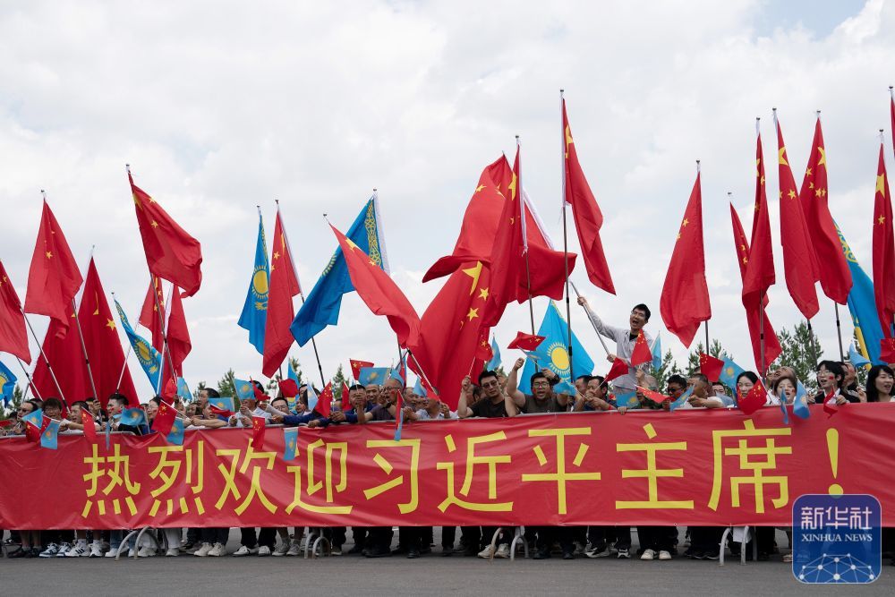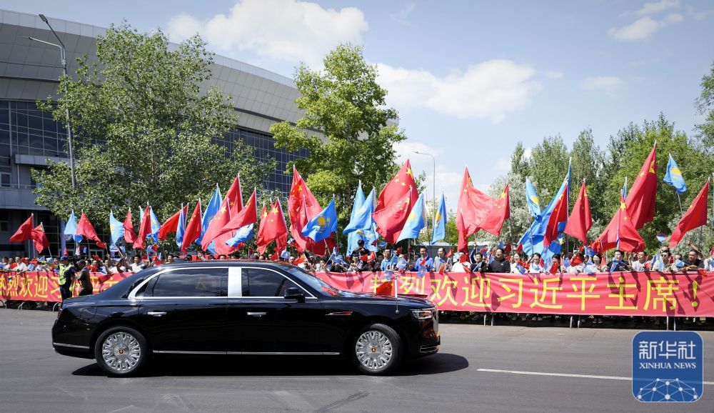 习近平乘车从机场赴下榻饭店途中,中资企业和留学生代表聚集在道路两旁,手持“热烈欢迎习近平主席!”“中哈友谊万岁!”等红色横幅,热烈欢迎习近平到访。