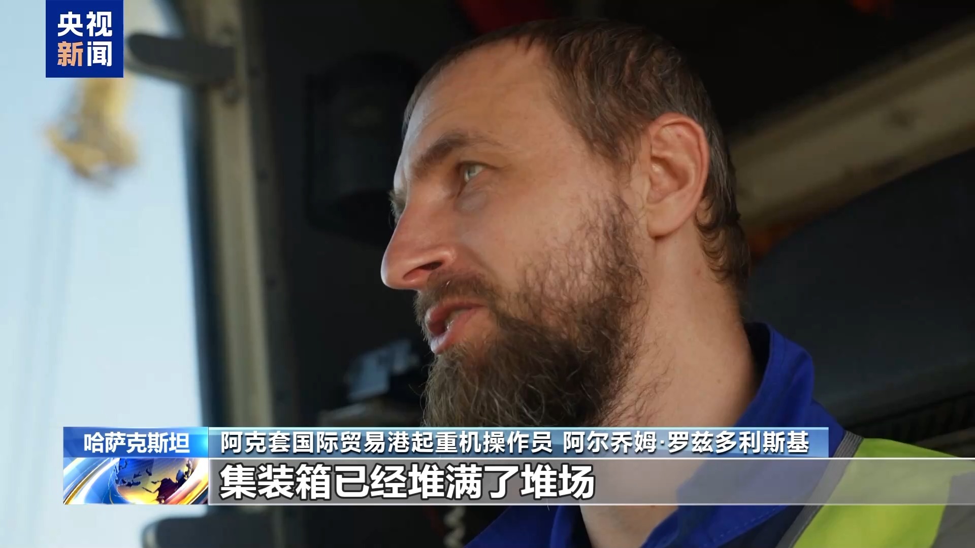 阿克套国际贸易港起重机操作员 阿尔乔姆·罗兹多利斯基:你可以看到,集装箱已经堆满了堆场,数量较以往大幅增加。现在我们的任务是把集装箱装上驳船,还剩下大约54个箱子要装运,希望能在换班前装完。