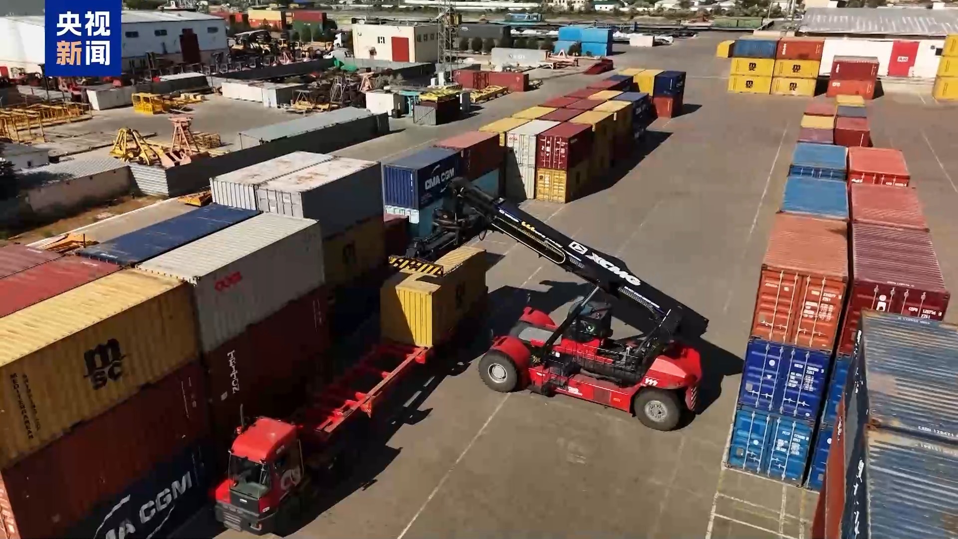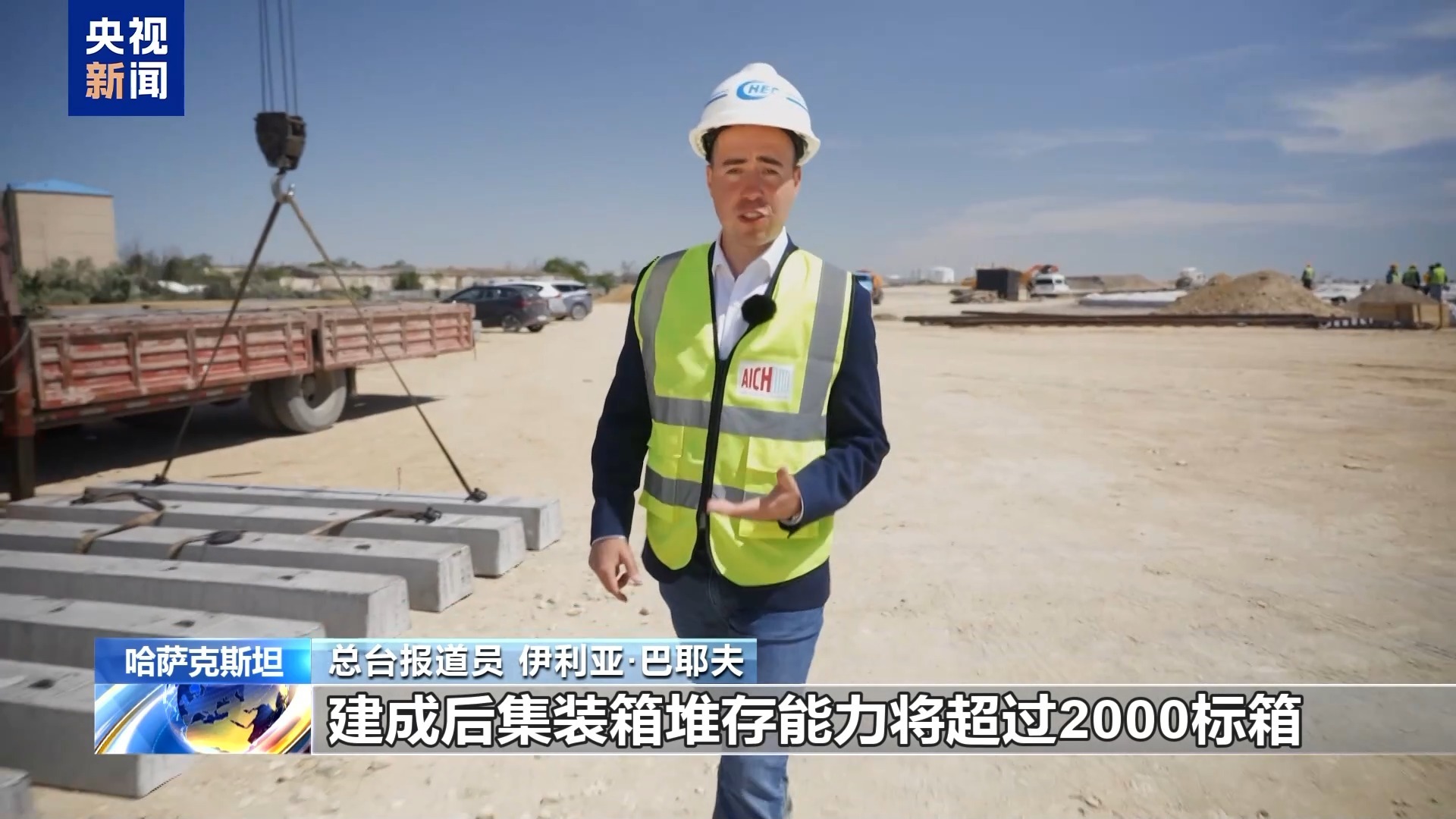 总台报道员 伊利亚·巴耶夫:该项目建设工程占地面积达19公顷,施工采用全天候作业模式,建成后集装箱堆存能力将超过2000标箱,为保障物流效率,配套新建了11条铁路专用线,目前首批轨道铺设工程已正式启动。